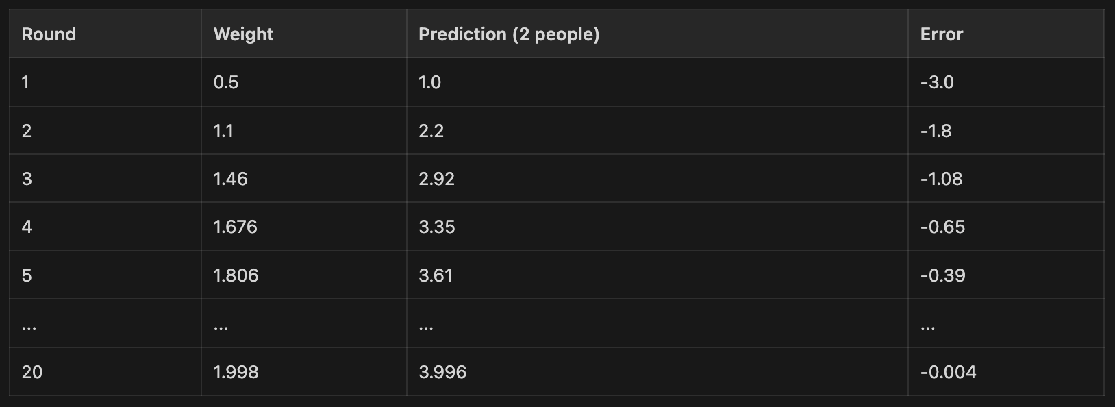 Nobody told the computer the answer was 2 cups per person. It started at 0.5 and found its way there by repeatedly predicting, checking the error, and nudging the weight in the right direction.
